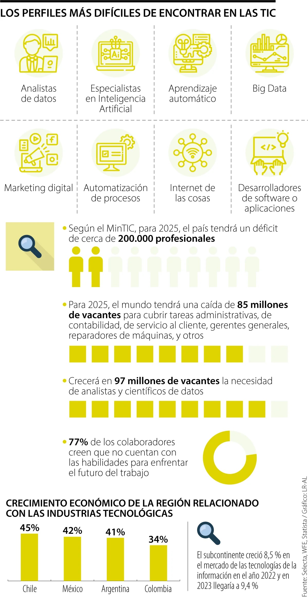Según ManpowerGroup, Colombia está por debajo de Chile (45%), México (42%) y Argentina (41%) en cantidad de egresados en perfiles del sector tecnológico. De hecho, el Ministerio de Tecnología e Información aseguró que para 2025 el país tendrá un déficit cercano a los 200.000 profesionales.